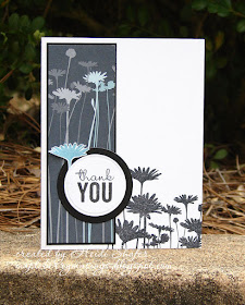I mounted a narrow piece of Urban Garden paper on black cardstock. I stamped the Upsy Daisy image using black ink directly on my white card base and then added the patterned paper. I stamped the sentiment from Painted Petals on a white circle, also matting it with black cardstock. I stamped a portion of the stamp using Baja Breeze ink and cut out one of the daisies. I tucked it in between the circles to add a spot of color and dimension. Simple!