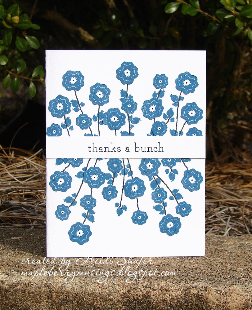 I stamped black stems on a white card base using an image from Remember, trying to vary the heights and placement. I randomly stamped a small bud image from Bitty Bouquets in the same blue as the flowers. Then I glued down my flowers to create the floral spray design. I used a black marker to change the color of the small dot in the flower centers.